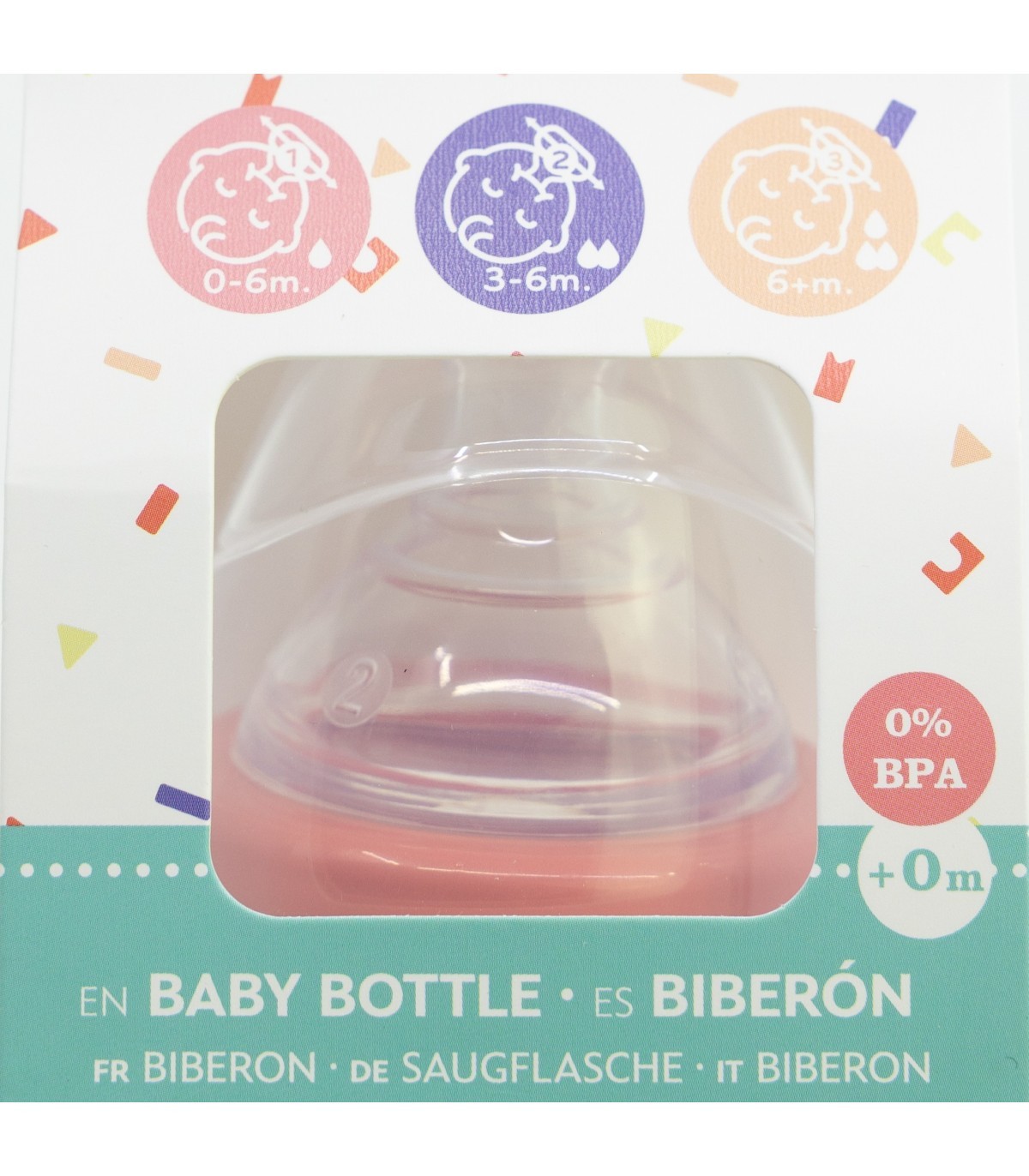 Biberón con asas y de cuello ancho y tetina de silicona con 3 posiciones: girando el biberón, regulas la intensidad de la salida de líquido, garantizando una correcta succión desde el primer día.