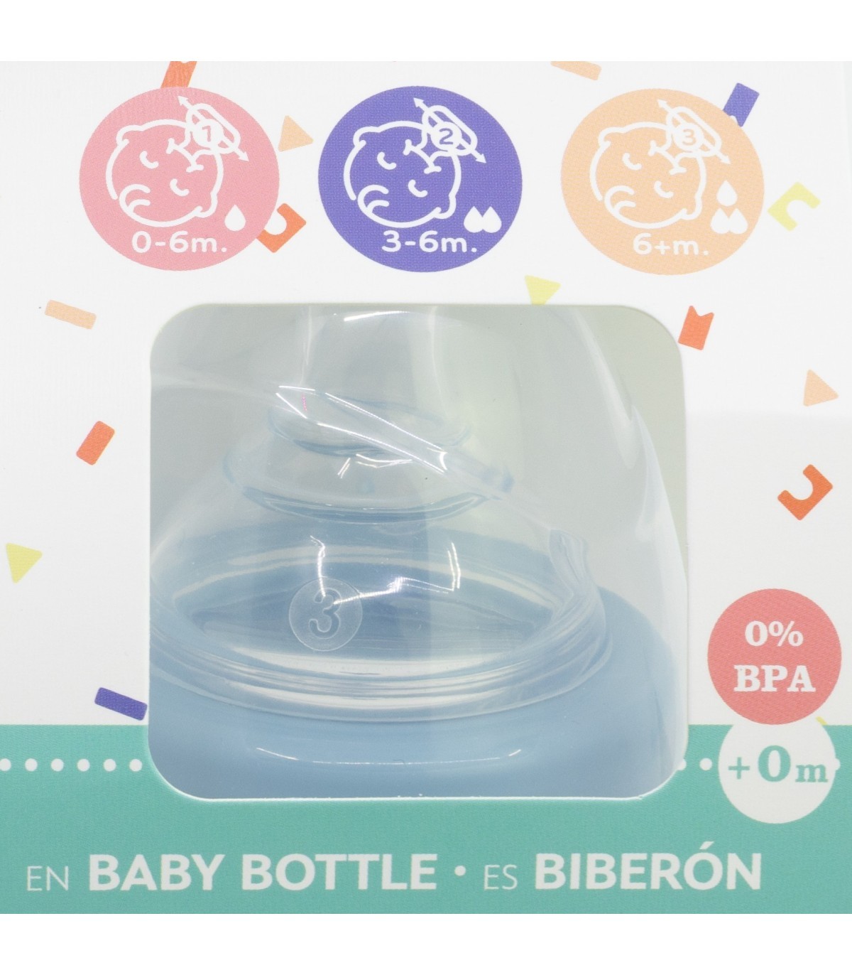 Biberón de cuello ancho y tetina de silicona con 3 posiciones: girando el biberón, regulas la intensidad de la salida de líquido, garantizando una correcta succión desde el primer día.