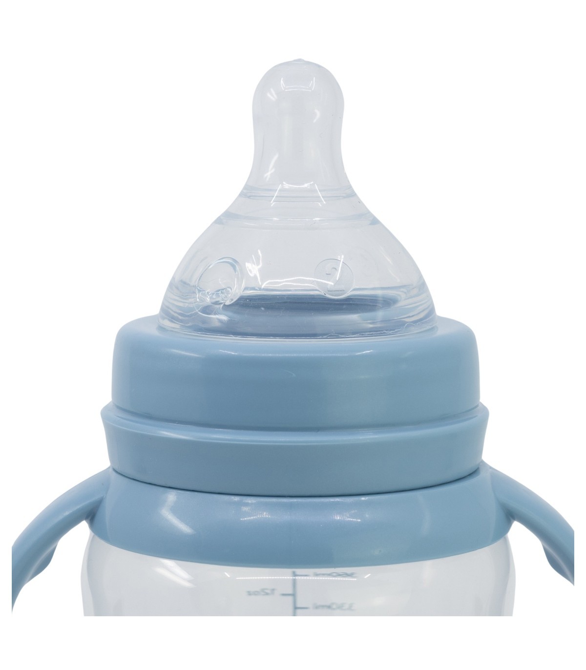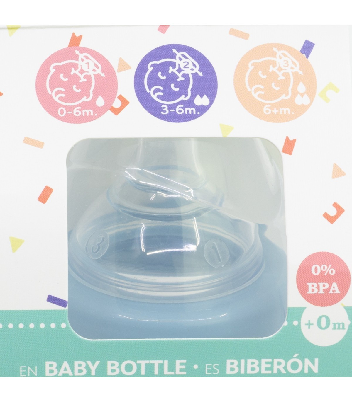 Biberón con asas y de cuello ancho y tetina de silicona con 3 posiciones: girando el biberón, regulas la intensidad de la salida de líquido, garantizando una correcta succión desde el primer día.