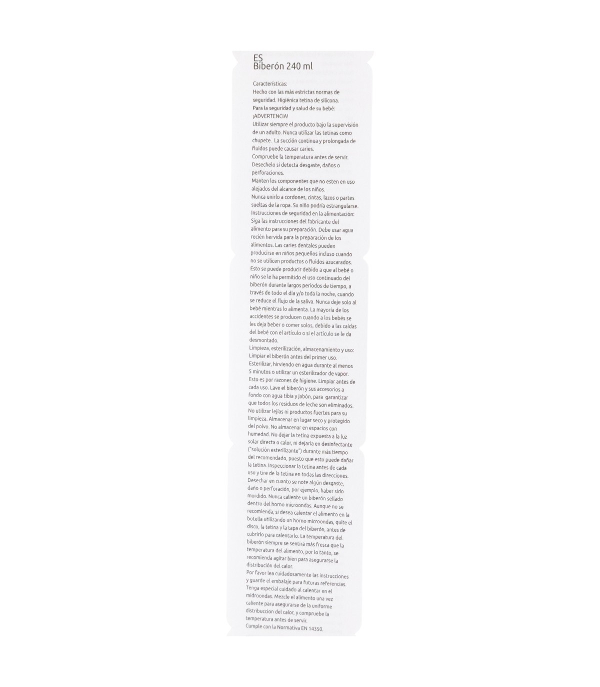 Para la seguridad de su bebé: ¡ADVERTENCIA! La succión continua y prolongada de líquidos puede causar caries. Comprobar siempre la temperatura de la comida antes de dar el alimento. Desechar en los primeros signos de daño o rotura. Mantener fuera del alcance de los niños todos los componentes que no estén en uso. Nunca unirlo a cordones, cintas, lazos o partes sueltas de la ropa. Su niño podría estrangularse. Nunca usar la tetina como chupete. Usar siempre este producto bajo la supervisión de un adulto. Limpieza, esterilización, almacenamiento y uso: Limpie el producto antes del primer uso y después de cada uso. Por razones de higiene, esterilícelo hirviéndolo en agua durante al menos 5 minutos o utilizando un esterilizador de vapor. Lave el producto y sus accesorios cuidadosamente con agua tibia y jabón. No utilice lejía ni otros productos de limpieza agresivos. Guárdelo en un lugar seco y libre de polvo. No exponga la tetina a la luz solar directa ni a fuentes de calor, ni la deje en desinfectantes ("soluciones esterilizantes") por más tiempo del recomendado, ya que podría dañarse. Inspeccione la tetina antes de cada uso, estirándola y tirando de ella en todas las direcciones. Deséchela si detecta signos de desgaste, daños o perforaciones (por ejemplo, si el bebé la ha mordido). Sustituya el producto si presenta grietas, deformaciones o cambios en el color o la textura. Úselo de acuerdo con las recomendaciones indicadas. El uso inadecuado o los daños visibles pueden comprometer su idoneidad para el contacto con alimentos. Lea atentamente las instrucciones y conserve el envase para futuras consultas. Instrucciones de seguridad: Para preparar los alimentos, siga las instrucciones del fabricante. Tenga especial cuidado al calentar en el microondas. Nunca caliente un producto cerrado en el microondas. Aunque no se recomienda, si decide usar el microondas para calentar el contenido, asegúrese de introducir solo el cuerpo del biberón, vaso o taza. Retire el disco, tetina, tapa o cualquier otro componente antes de calentar. La temperatura exterior del producto puede no reflejar la temperatura real de su contenido. Agite o remueva bien después de calentar para garantizar una distribución uniforme del calor. No sobrecaliente el producto. Las caries dentales pueden producirse incluso sin uso de productos o líquidos azucarados. Esto puede ocurrir si se permite que el bebé o niño utilice el biberón de forma continua durante largos periodos del día o, especialmente, durante la noche, cuando el nivel de saliva es menor. Nunca deje al bebé alimentarse solo. La mayoría de los accidentes ocurren cuando los bebés son dejados solos mientras beben o comen, debido a caídas con el artículo o a su desmontaje. Cumple con la norma EN 14350:2020+A1:2023.
