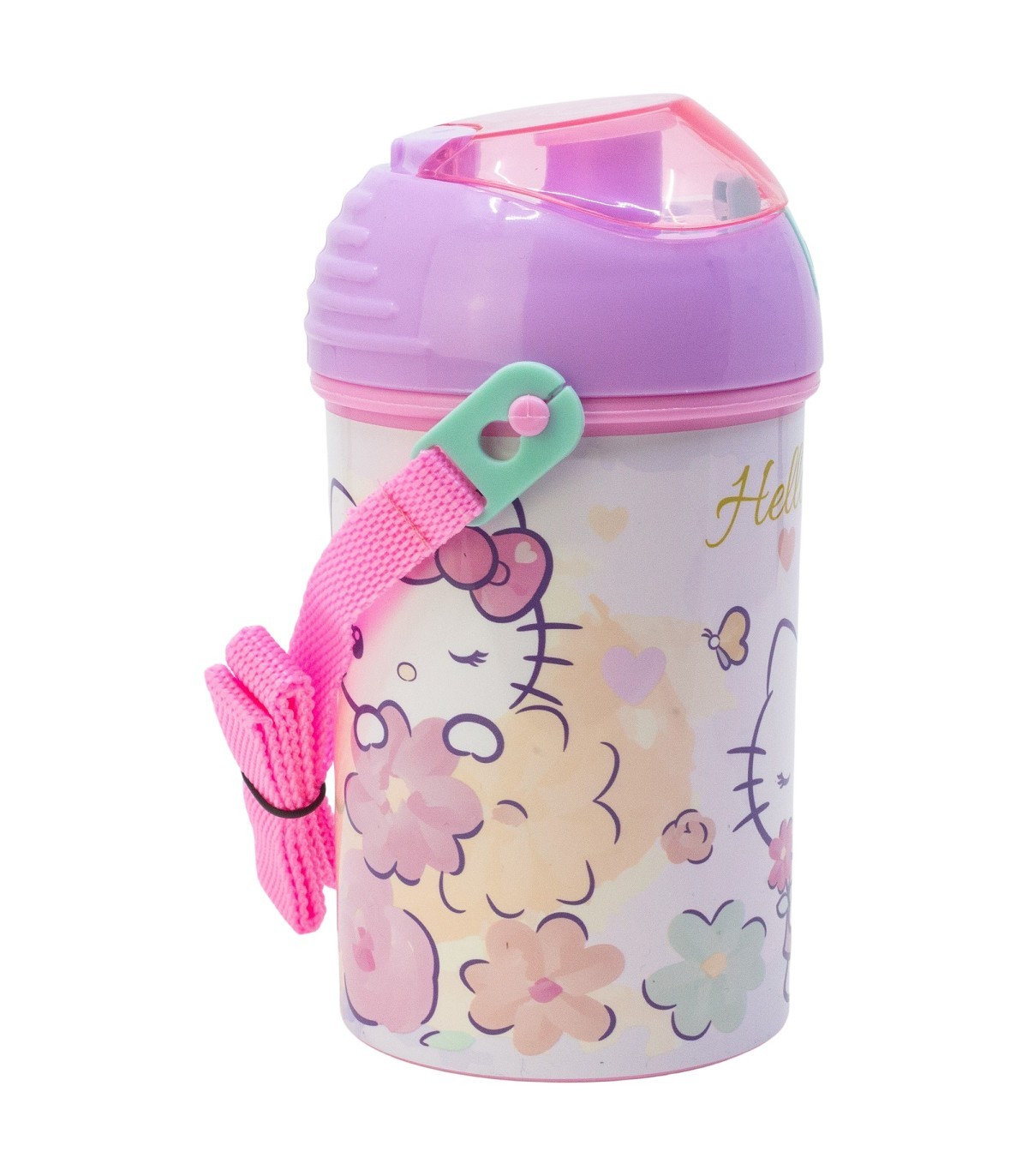 Práctica botella de plástico con un tapón con cierre de seguridad y correas con medidas de seguridad incorporadas.