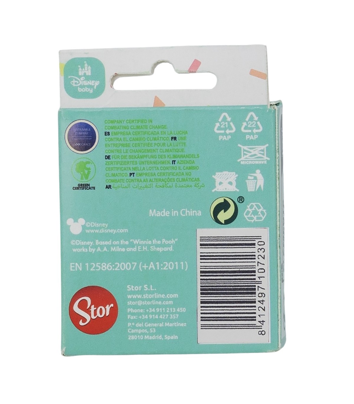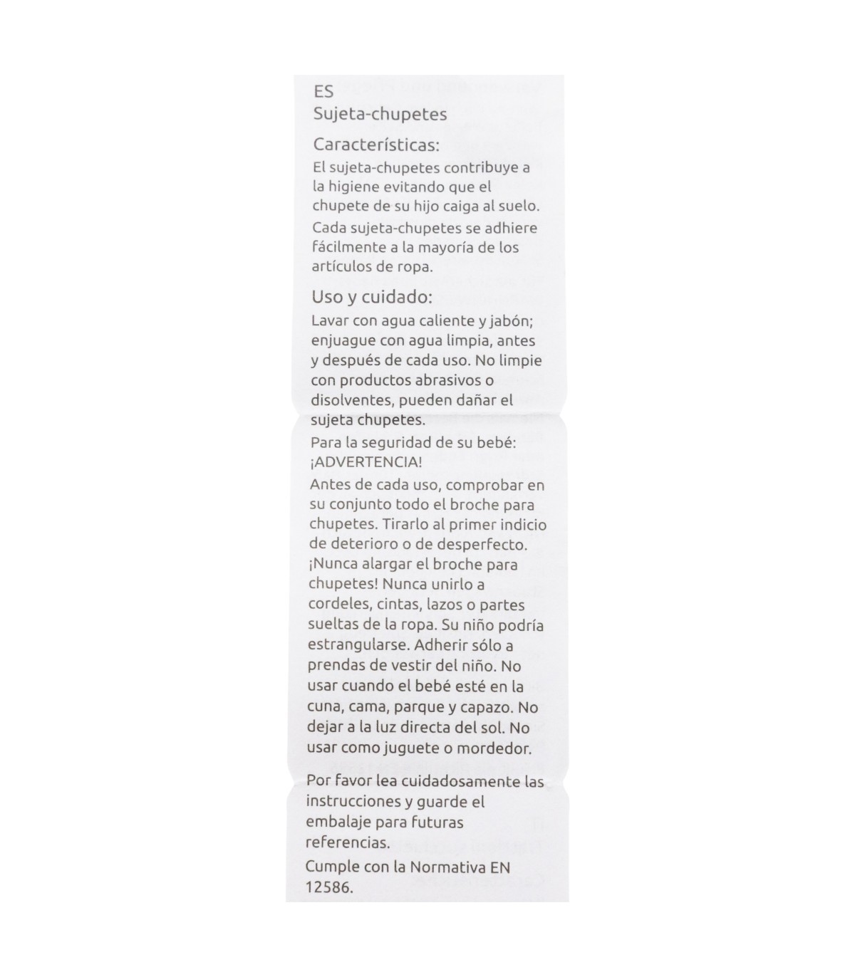 ¡ADVERTENCIA! Antes de cada uso, comprobar en su conjunto todo el broche para chupetes. Desechar al primer indicio de deterioro o de desperfecto. ¡Nunca alargar el broche para chupetes! Nunca unirlo a cordeles, cintas, lazos o partes sueltas de la ropa. Su bebé podría estrangularse. Limpieza, esterilización, almacenamiento y uso: Lave el producto antes del primer uso y después de cada uso. Lávelo con agua tibia y jabón. No utilice esponjas abrasivas ni productos químicos agresivos. Guárdelo en un lugar seco y libre de polvo. No exponga el producto a la luz solar directa ni a fuentes de calor, ni lo deje en desinfectantes ("soluciones esterilizantes") por más tiempo del recomendado. Sustituya el producto si presenta grietas, deformaciones o cambios en el color o la textura. Instrucciones de seguridad: Adherir únicamente a la ropa del niño. No utilizar cuando el bebé esté en una cuna, cama, parque de bebé o cochecito. Este producto NO ES UN JUGUETE. Mantener fuera del alcance de los niños todos los componentes que no estén en uso. Úselo de acuerdo con las recomendaciones indicadas. Lea atentamente las instrucciones y conserve el envase para futuras consultas. Cumple con la norma EN 12586:2025.