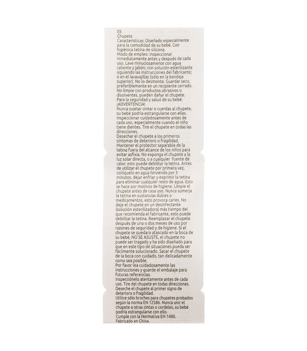 Para la seguridad de su bebé: ¡ADVERTENCIA! Inspecciónelo atentamente antes de cada uso. Tire del chupete en todas las direcciones. Deseche el chupete al primer signo de deterioro o fragilidad. Utilice sólo broches para chupetes probados según la Norma EN 12586. Nunca unir el chupete a otras cintas o cordeles, su bebé podría estrangularse con ellas. Mantener el protector separable de la tetina fuera del alcance de los niños para evitar el riesgo de asfixia. Limpieza, esterilización, almacenamiento y uso: Antes de usar el chupete por primera vez, colóquelo en agua hirviendo durante cinco minutos, déjelo enfriar y presione la tetina para eliminar cualquier resto de agua (por razones de higiene). Limpie el chupete antes de cada uso. Lávelo cuidadosamente con agua caliente y jabón, o con una solución esterilizante (siguiendo las instrucciones del fabricante). No lo limpie con productos abrasivos o disolventes, ya que podrían dañar el chupete. Guárdelo seco, preferiblemente en un recipiente cerrado. No exponga el chupete a la luz solar directa ni a ninguna fuente de calor, ya que podría debilitar la tetina. Sustituya el chupete entre uno y dos meses de uso, por razones de seguridad e higiene. Sustituya el producto si presenta grietas, deformaciones o cambios en el color o la textura. No lo desmonte. Recomendaciones de seguridad: No sumerja nunca la tetina en sustancias dulces ni medicamentos, ya que puede causar caries dental. Si el chupete se queda atascado en la boca del bebé, NO SE ALARME. El chupete no puede tragarse y ha sido diseñado para que estas situaciones se resuelvan fácilmente. Extraiga el chupete con la mayor suavidad y cuidado posible. Utilícelo siguiendo las recomendaciones indicadas. Lea atentamente las instrucciones y conserve el embalaje para futuras consultas. Cumple con la norma EN 1400:2023.