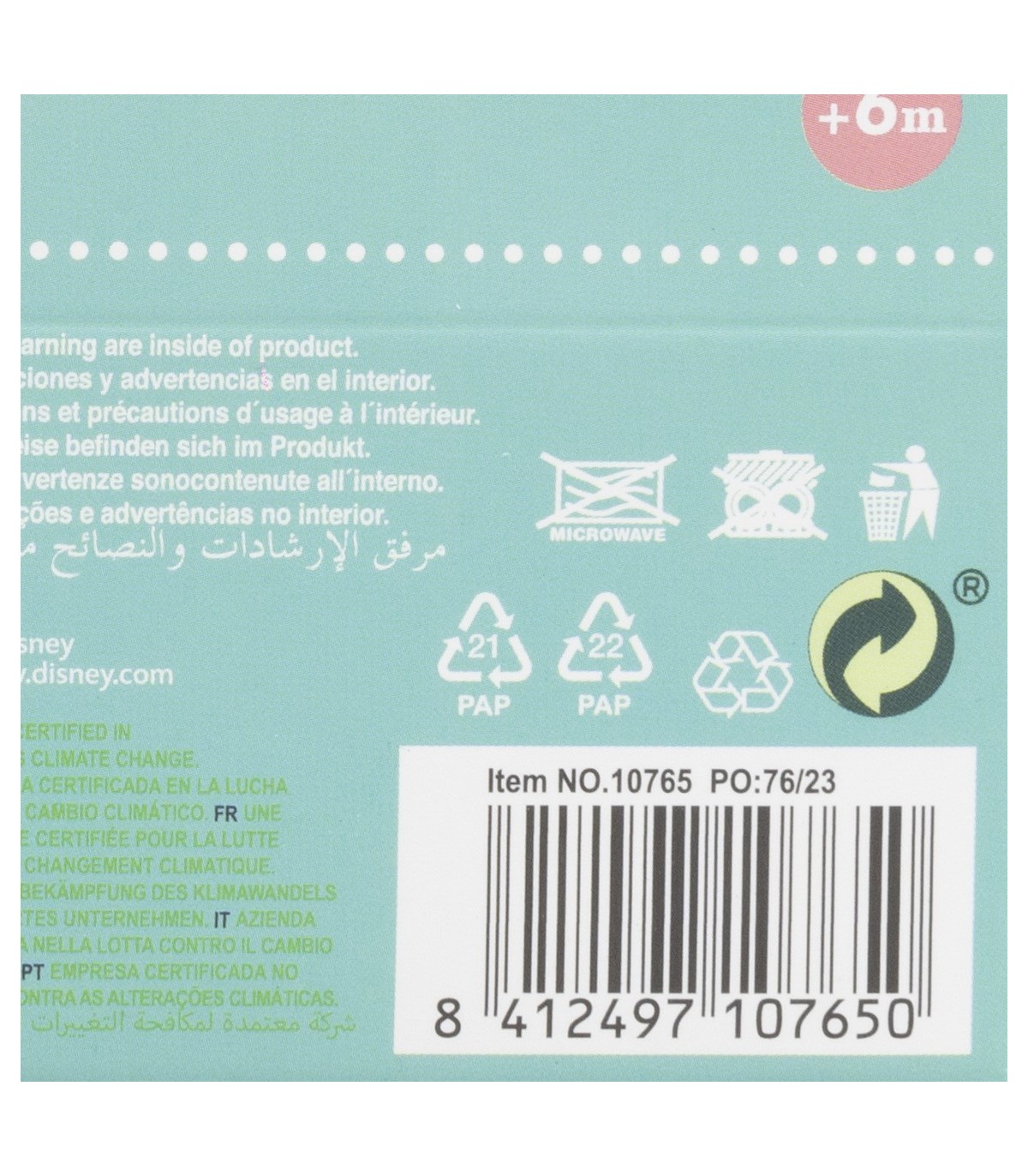 Para la seguridad de su bebé: ¡ADVERTENCIA! Inspecciónelo atentamente antes de cada uso. Tire del chupete en todas las direcciones. Deseche el chupete al primer signo de deterioro o fragilidad. Utilice sólo broches para chupetes probados según la Norma EN 12586. Nunca unir el chupete a otras cintas o cordeles, su bebé podría estrangularse con ellas. Mantener el protector separable de la tetina fuera del alcance de los niños para evitar el riesgo de asfixia. Limpieza, esterilización, almacenamiento y uso: Antes de usar el chupete por primera vez, colóquelo en agua hirviendo durante cinco minutos, déjelo enfriar y presione la tetina para eliminar cualquier resto de agua (por razones de higiene). Limpie el chupete antes de cada uso. Lávelo cuidadosamente con agua caliente y jabón, o con una solución esterilizante (siguiendo las instrucciones del fabricante). No lo limpie con productos abrasivos o disolventes, ya que podrían dañar el chupete. Guárdelo seco, preferiblemente en un recipiente cerrado. No exponga el chupete a la luz solar directa ni a ninguna fuente de calor, ya que podría debilitar la tetina. Sustituya el chupete entre uno y dos meses de uso, por razones de seguridad e higiene. Sustituya el producto si presenta grietas, deformaciones o cambios en el color o la textura. No lo desmonte. Recomendaciones de seguridad: No sumerja nunca la tetina en sustancias dulces ni medicamentos, ya que puede causar caries dental. Si el chupete se queda atascado en la boca del bebé, NO SE ALARME. El chupete no puede tragarse y ha sido diseñado para que estas situaciones se resuelvan fácilmente. Extraiga el chupete con la mayor suavidad y cuidado posible. Utilícelo siguiendo las recomendaciones indicadas. Lea atentamente las instrucciones y conserve el embalaje para futuras consultas. Cumple con la norma EN 1400:2023.