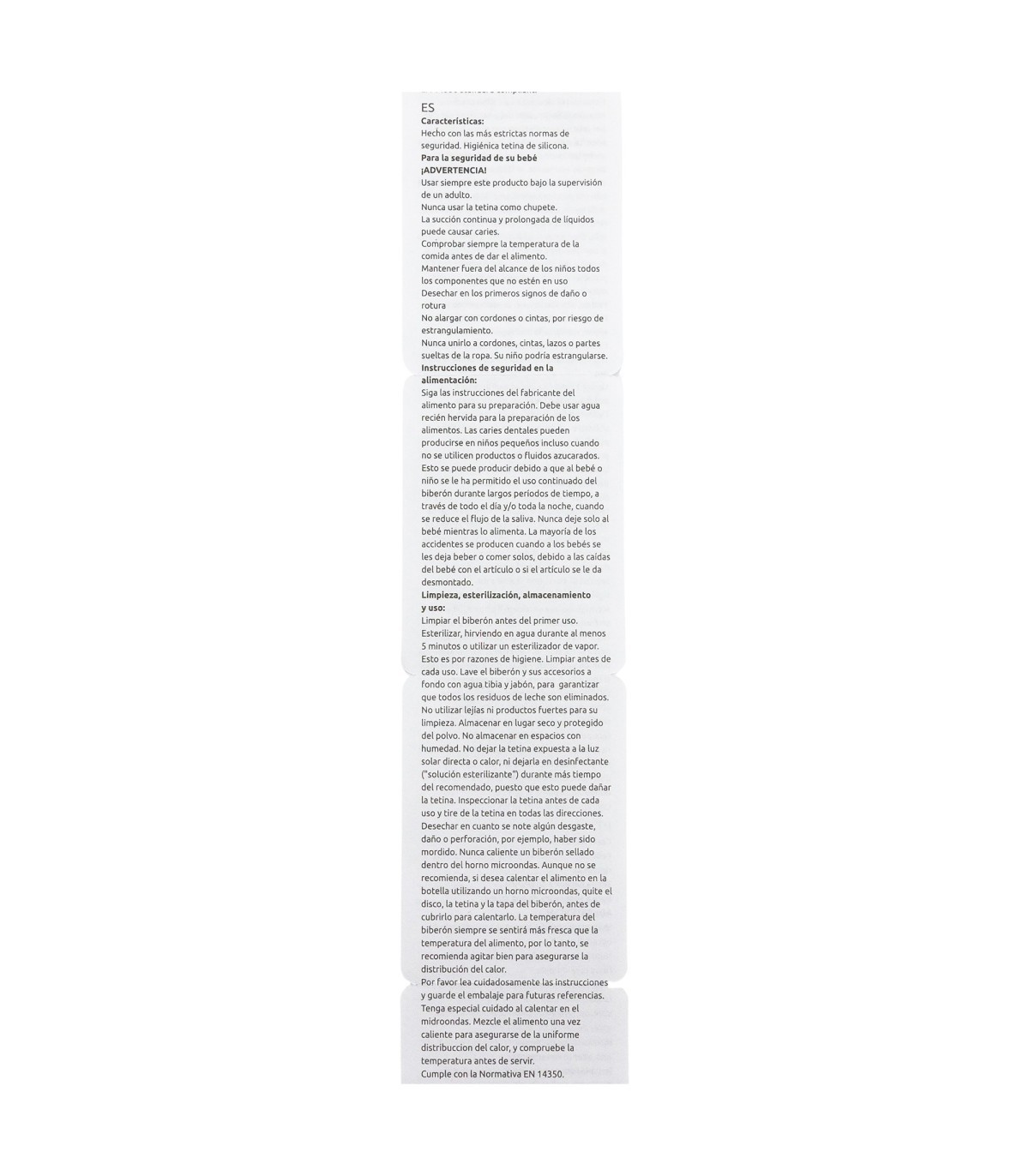 Para la seguridad de su bebé: ¡ADVERTENCIA! La succión continua y prolongada de líquidos puede causar caries. Desechar en los primeros signos de daño o rotura Mantener fuera del alcance de los niños todos los componentes que no estén en uso Nunca unirlo a cordones, cintas, lazos o partes sueltas de la ropa. Su niño podría estrangularse. Usar siempre este producto bajo la supervisión de un adulto. Limpieza, esterilización, almacenamiento y uso: Limpie el producto antes de cada uso. Lave el producto y sus accesorios cuidadosamente con agua tibia y jabón. No utilice lejía ni otros productos de limpieza agresivos. Guárdelo en un lugar seco y libre de polvo. No exponga el producto a la luz solar directa ni a fuentes de calor, ni la deje en desinfectantes ("soluciones esterilizantes") por más tiempo del recomendado, ya que podría dañarse. Sustituya el producto si presenta grietas, deformaciones o cambios en el color o la textura. Lea atentamente las instrucciones y conserve el envase para futuras consultas. Úselo de acuerdo con las recomendaciones indicadas. El uso inadecuado o los daños visibles pueden comprometer su idoneidad para el contacto con alimentos. Instrucciones de seguridad: Las caries dentales pueden producirse incluso sin uso de productos o líquidos azucarados. Nunca deje al bebé alimentarse solo. La mayoría de los accidentes ocurren cuando los bebés son dejados solos mientras beben o comen, debido a caídas con el artículo o a su desmontaje.