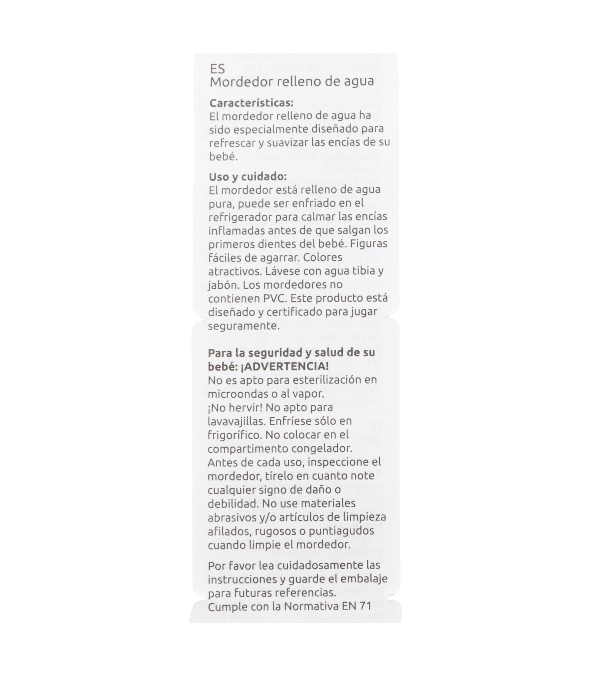 Este mordedor puede enfriarse en el frigorífico para ayudar a calmar las encías del bebé. Su forma facilita el agarre. Libre de PVC y seguro para jugar suavemente. Para la seguridad de su bebé: ¡ADVERTENCIA! Enfriar únicamente en un frigorífico doméstico; no colocar en el compartimento del congelador. No apto para esterilización en microondas ni por vapor. No hervir. No apto para lavavajillas. Limpieza, esterilización, almacenamiento y uso: Lave el producto antes del primer uso y después de cada uso. Lave el producto con agua tibia y jabón. No utilice esponjas abrasivas ni productos químicos agresivos. Guárdelo en un lugar seco y libre de polvo. No exponga el producto a la luz solar directa ni a fuentes de calor, ni lo deje en desinfectantes ("soluciones esterilizantes") por más tiempo del recomendado. Antes de cada uso, inspeccione el producto. Desechar en los primeros signos de daño o rotura. Sustituya el producto si presenta grietas, deformaciones o cambios de color o textura. Úselo de acuerdo con las recomendaciones indicadas. Lea atentamente las instrucciones y conserve el envase para futuras consultas. Recomendaciones de seguridad: Usar siempre este producto bajo la supervisión de un adulto. Nunca unirlo a cordones, cintas, lazos o partes sueltas de la ropa. Su niño podría estrangularse. Cumple con la norma EN 71.