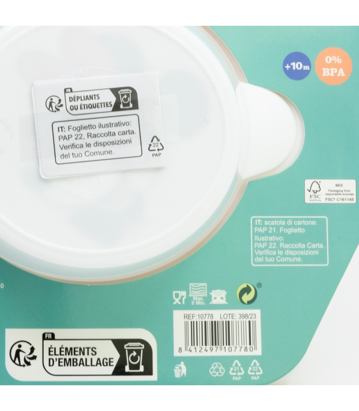 Para la seguridad de su bebé: ¡ADVERTENCIA! Usar siempre este producto bajo la supervisión de un adulto. Inspecciónelo atentamente antes de cada uso. Desechar en los primeros signos de daño o rotura. Limpieza, esterilización, almacenamiento y uso: Lave el producto antes del primer uso y después de cada uso. Limpie el producto y sus accesorios cuidadosamente con agua tibia y jabón. No utilice lejía ni otros productos de limpieza agresivos. Guarde en un lugar seco, libre de polvo. No exponga el producto a la luz solar directa ni a fuentes de calor, ni lo deje en desinfectante ("solución esterilizante") más tiempo del recomendado, ya que podría dañarse. Sustituya el producto si presenta grietas, deformaciones o cambios de color o textura. Úselo según las recomendaciones indicadas. Un uso indebido o los daños visibles pueden comprometer su idoneidad para el contacto con alimentos. Lea atentamente las instrucciones y conserve el embalaje para futuras consultas. Instrucciones de seguridad: Mantenga fuera del alcance de los niños los componentes que no estén en uso. No lo ate nunca a cordones, cintas, encajes o partes sueltas de la ropa. El niño podría estrangularse. Tenga especial cuidado al calentar en el microondas. No sobrecaliente el producto. Remueva siempre la comida caliente para asegurar una distribución uniforme del calor y pruebe la temperatura antes de servirla. Cumple con la norma EN 14372.