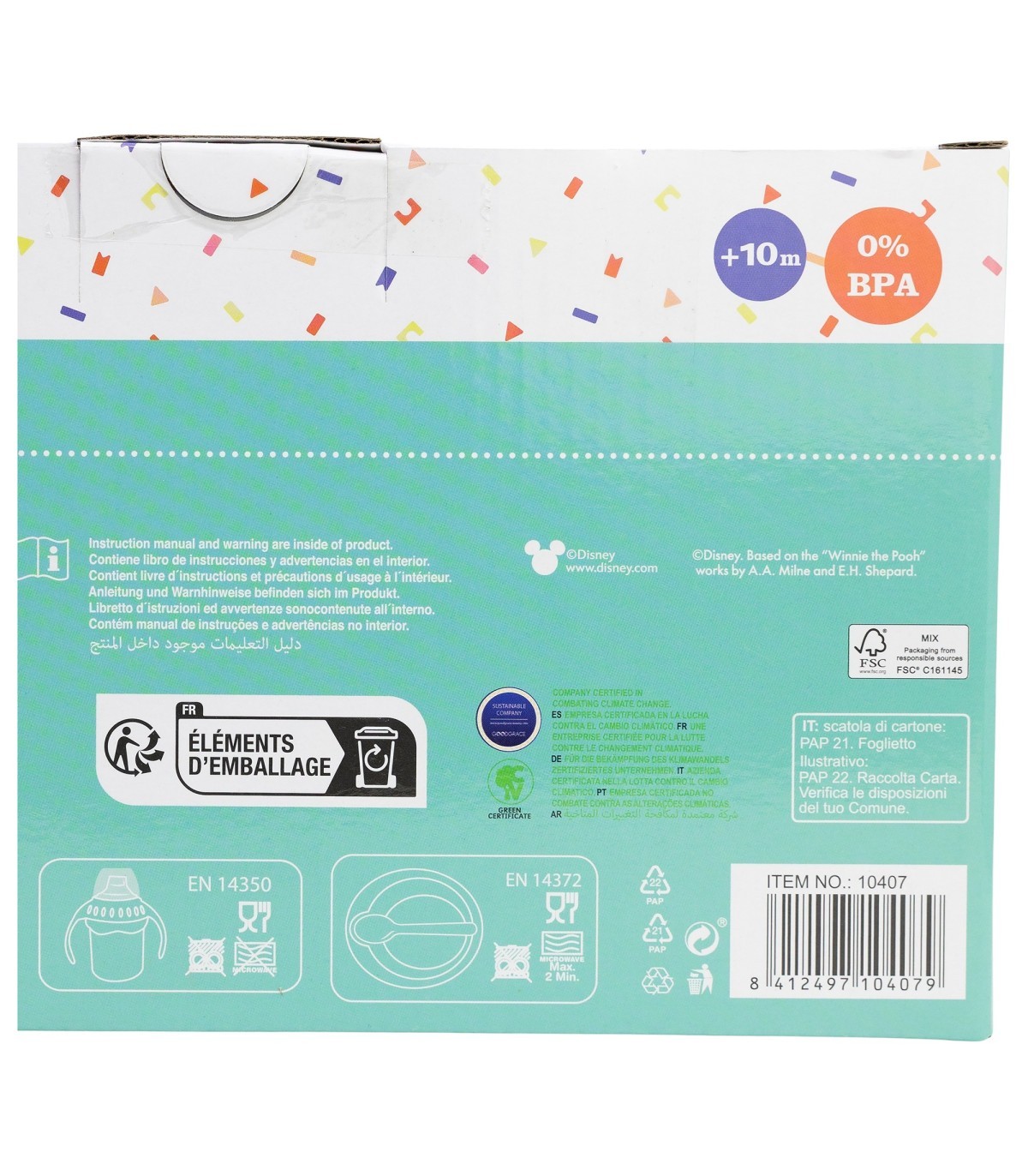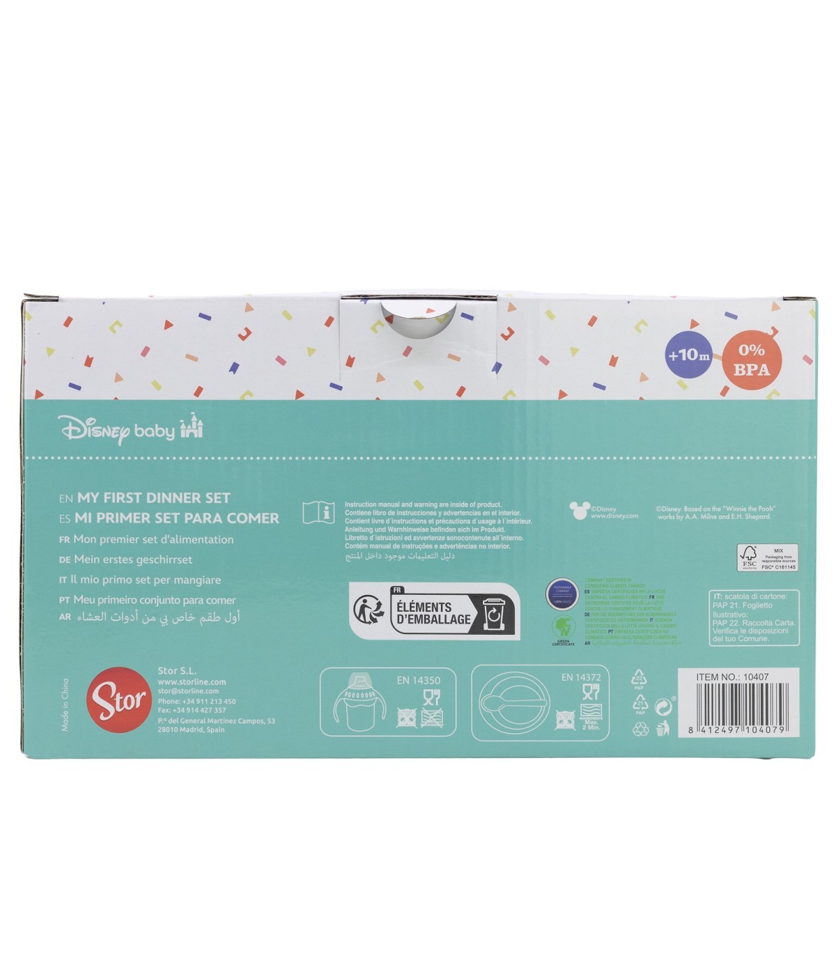 Set de vajilla infantil para las primeras papillas del bebé decorado con sus personajes favoritos. Incluye un plato una cuchara y un vaso de transición de 250 ml para desarrollar su habilidad para beber y comer por sí mismo.