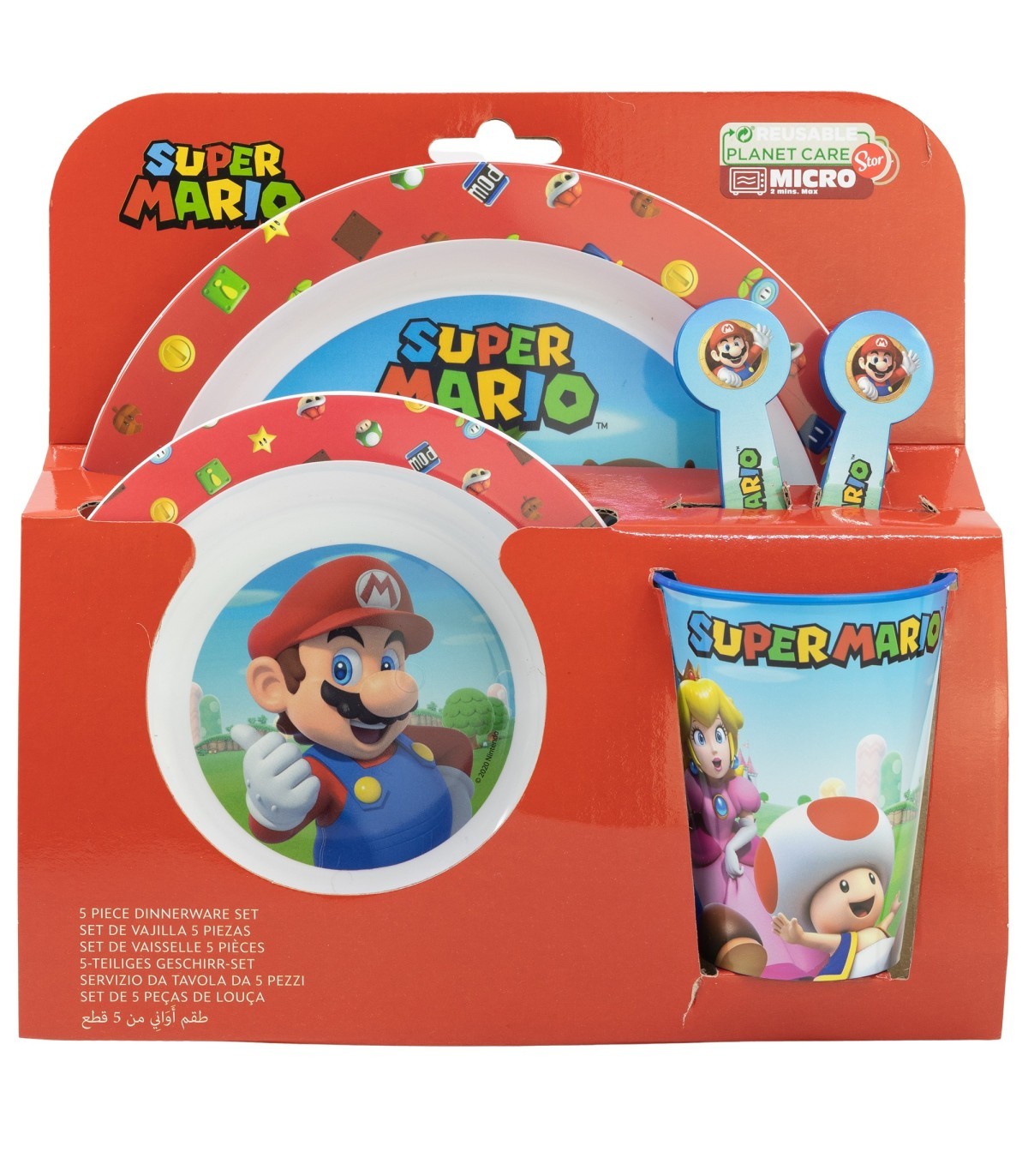 SET MICRO 5 PCS (PLATO, CUENCO, VASO Y CUBIERTOS) EN CAJA SUPER MARIO