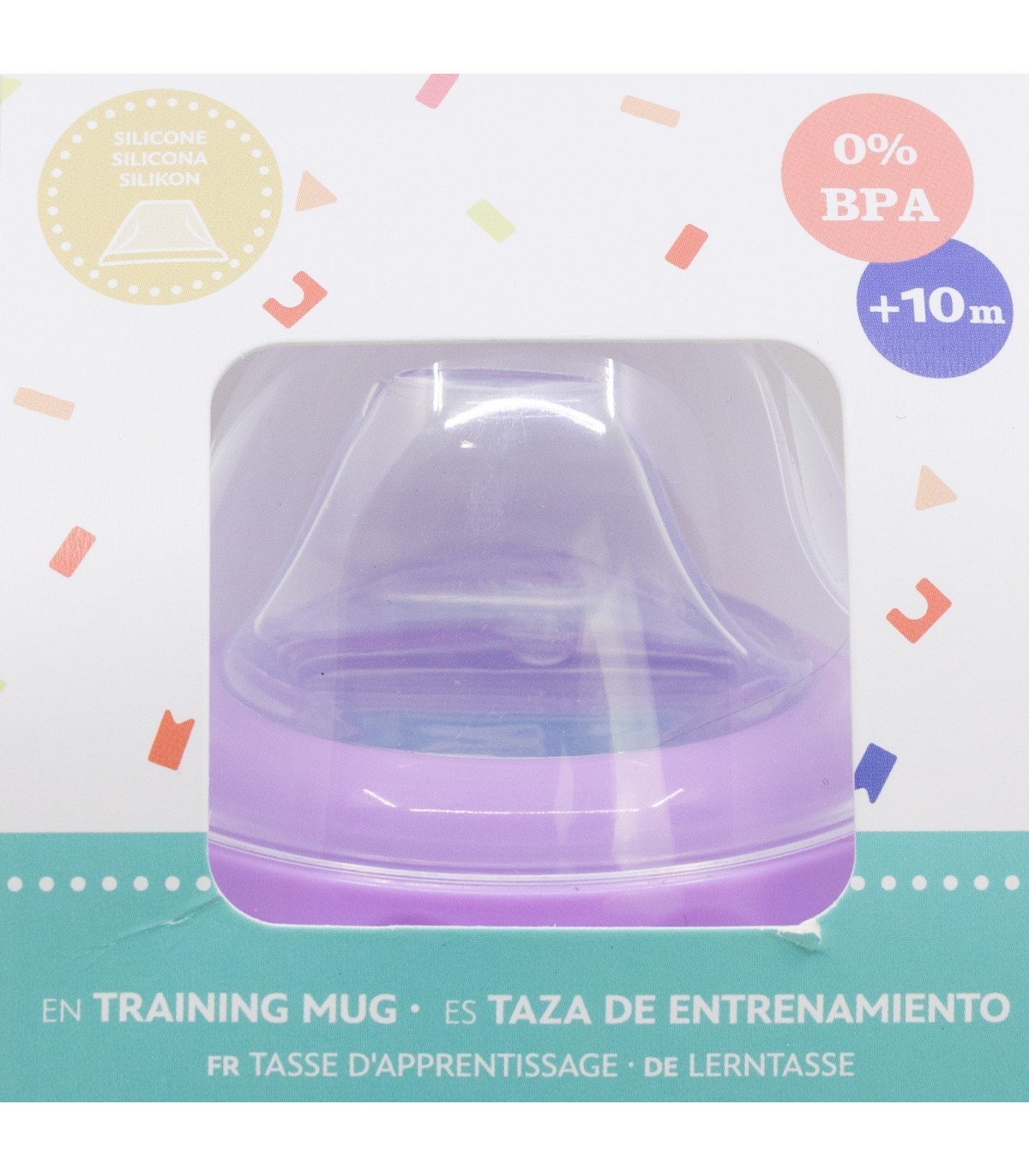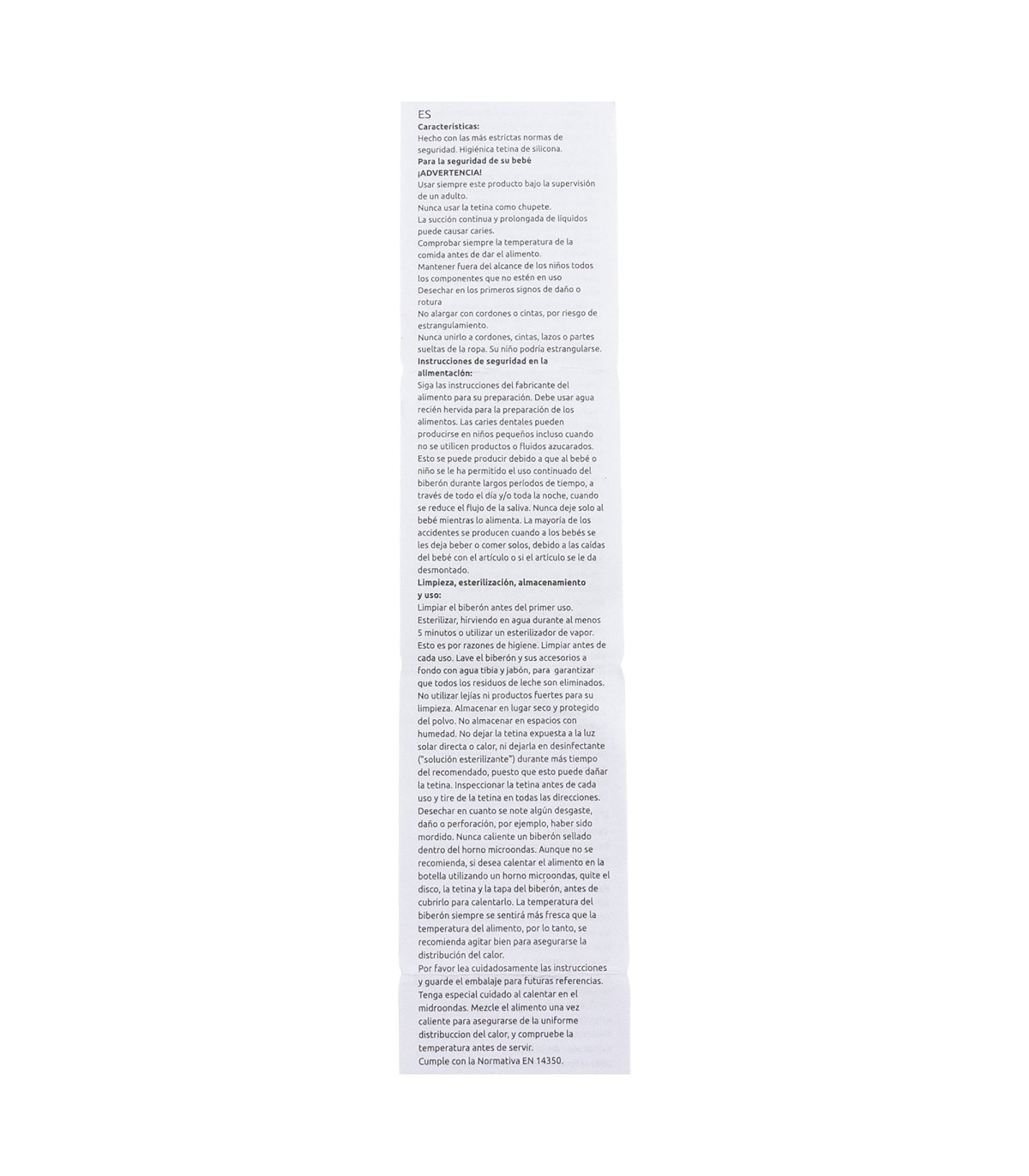 Para la seguridad de su bebé: ¡ADVERTENCIA! La succión continua y prolongada de líquidos puede causar caries. Comprobar siempre la temperatura de la comida antes de dar el alimento. Desechar en los primeros signos de daño o rotura. Mantener fuera del alcance de los niños todos los componentes que no estén en uso. Nunca unirlo a cordones, cintas, lazos o partes sueltas de la ropa. Su niño podría estrangularse. Nunca usar la tetina como chupete. Usar siempre este producto bajo la supervisión de un adulto. Limpieza, esterilización, almacenamiento y uso: Limpie el producto antes del primer uso y después de cada uso. Por razones de higiene, esterilícelo hirviéndolo en agua durante al menos 5 minutos o utilizando un esterilizador de vapor. Lave el producto y sus accesorios cuidadosamente con agua tibia y jabón. No utilice lejía ni otros productos de limpieza agresivos. Guárdelo en un lugar seco y libre de polvo. No exponga la tetina a la luz solar directa ni a fuentes de calor, ni la deje en desinfectantes ("soluciones esterilizantes") por más tiempo del recomendado, ya que podría dañarse. Inspeccione la tetina antes de cada uso, estirándola y tirando de ella en todas las direcciones. Deséchela si detecta signos de desgaste, daños o perforaciones (por ejemplo, si el bebé la ha mordido). Sustituya el producto si presenta grietas, deformaciones o cambios en el color o la textura. Úselo de acuerdo con las recomendaciones indicadas. El uso inadecuado o los daños visibles pueden comprometer su idoneidad para el contacto con alimentos. Lea atentamente las instrucciones y conserve el envase para futuras consultas. Instrucciones de seguridad: Para preparar los alimentos, siga las instrucciones del fabricante. Tenga especial cuidado al calentar en el microondas. Nunca caliente un producto cerrado en el microondas. Aunque no se recomienda, si decide usar el microondas para calentar el contenido, asegúrese de introducir solo el cuerpo del biberón, vaso o taza. Retire el disco, tetina, tapa o cualquier otro componente antes de calentar. La temperatura exterior del producto puede no reflejar la temperatura real de su contenido. Agite o remueva bien después de calentar para garantizar una distribución uniforme del calor. No sobrecaliente el producto. Las caries dentales pueden producirse incluso sin uso de productos o líquidos azucarados. Esto puede ocurrir si se permite que el bebé o niño utilice el biberón de forma continua durante largos periodos del día o, especialmente, durante la noche, cuando el nivel de saliva es menor. Nunca deje al bebé alimentarse solo. La mayoría de los accidentes ocurren cuando los bebés son dejados solos mientras beben o comen, debido a caídas con el artículo o a su desmontaje. Cumple con la norma EN 14350:2020+A1:2023.