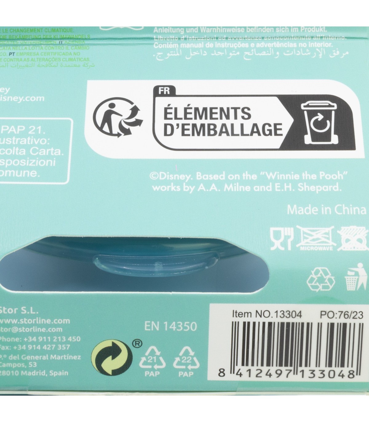 Para la seguridad de su bebé: ¡ADVERTENCIA! La succión continua y prolongada de líquidos puede causar caries. Comprobar siempre la temperatura de la comida antes de dar el alimento. Desechar en los primeros signos de daño o rotura. Mantener fuera del alcance de los niños todos los componentes que no estén en uso. Nunca unirlo a cordones, cintas, lazos o partes sueltas de la ropa. Su niño podría estrangularse. Usar siempre este producto bajo la supervisión de un adulto. Limpieza, esterilización, almacenamiento y uso: Limpie el producto antes del primer uso y después de cada uso. Por razones de higiene, esterilícelo hirviéndolo en agua durante al menos 5 minutos o utilizando un esterilizador de vapor. Lave el producto y sus accesorios cuidadosamente con agua tibia y jabón. No utilice lejía ni otros productos de limpieza agresivos. Guárdelo en un lugar seco y libre de polvo. No exponga el producto a la luz solar directa ni a fuentes de calor, ni lo deje en desinfectantes ("soluciones esterilizantes") por más tiempo del recomendado. Sustituya el producto si presenta grietas, deformaciones o cambios en el color o la textura. Lea atentamente las instrucciones y conserve el envase para futuras consultas. Úselo de acuerdo con las recomendaciones indicadas. El uso inadecuado o los daños visibles pueden comprometer su idoneidad para el contacto con alimentos. Instrucciones de seguridad: Para preparar los alimentos, siga las instrucciones del fabricante. Tenga especial cuidado al calentar en el microondas. Nunca caliente un producto cerrado en el microondas. Aunque no se recomienda, si decide usar el microondas para calentar el contenido, asegúrese de introducir solo el cuerpo del biberón, vaso o taza. Retire el disco, la tapa o cualquier otro componente antes de calentar. La temperatura exterior del producto puede no reflejar la temperatura real de su contenido. Agite o remueva bien después de calentar para garantizar una distribución uniforme del calor. No sobrecaliente el producto. Las caries dentales pueden producirse incluso sin uso de productos o líquidos azucarados. Esto puede ocurrir si se permite que el bebé o niño utilice el biberón de forma continua durante largos periodos del día o, especialmente, durante la noche, cuando el nivel de saliva es menor. Nunca deje al bebé alimentarse solo. La mayoría de los accidentes ocurren cuando los bebés son dejados solos mientras beben o comen, debido a caídas con el artículo o a su desmontaje. Cumple con la norma EN 14350:2020+A1:2023.